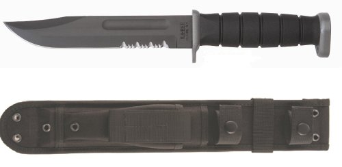 KA-BAR #1281 D2 EXTREME, has elite steel for superior cutting and edge retention.Cutting tests prove that D2 is one of the toughest steels used in knife making.Results show that the D2 Extreme Fighting / Utility knife cuts twice the amount of media as a standard carbon steel knife.In the C.A.T.R.A. Cutting Test, the D2 scored 300.6 mm, far exceeding it closest competition of only 168.8 mm.Knife comes with a KA-BAR / Extreme sheath featuring molded blade insert, ballistic nylon / Cordura construction, large utility pouch and multiple tie-down options.The D2 Extreme has grown to be one of our most popular fixed blade knives among our military, sportsmen, and collectors alike.One of a handful of machines like it in the world, the CATRA tester uses controlled pressure, stroke length, number of cycles and a certified sand-impregnated paper to determine the sharpness and edge-holding capabilities of a blade. * CATRA stands for Cutlery and Allied Trades Research Association.Product Specifications:Weight: 0.78 Overall length: 11 7/8"Blade Length: 7" Blade Shape: ClipBlade Stamp: USA Steel: D2 Edge Angle: 20 Grind: FlatButt Cap/Guard: Powdered Metal / 1095 CarbonHRC Rating: 59-60CR Handle: Kraton GMade In U.S.A.Comes with a Extreme Nylon / Cordura sheath..../ KA-BAR #1281 D2 Extreme with Extreme Sheath / Nylon Bar